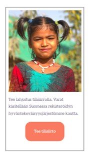 We have three convenient donations options for you to choose from: (the options need to be in three columns and add the links to the pages 1. Online donations 2. Donations in US and 3. Lahjoitukset Suomessa